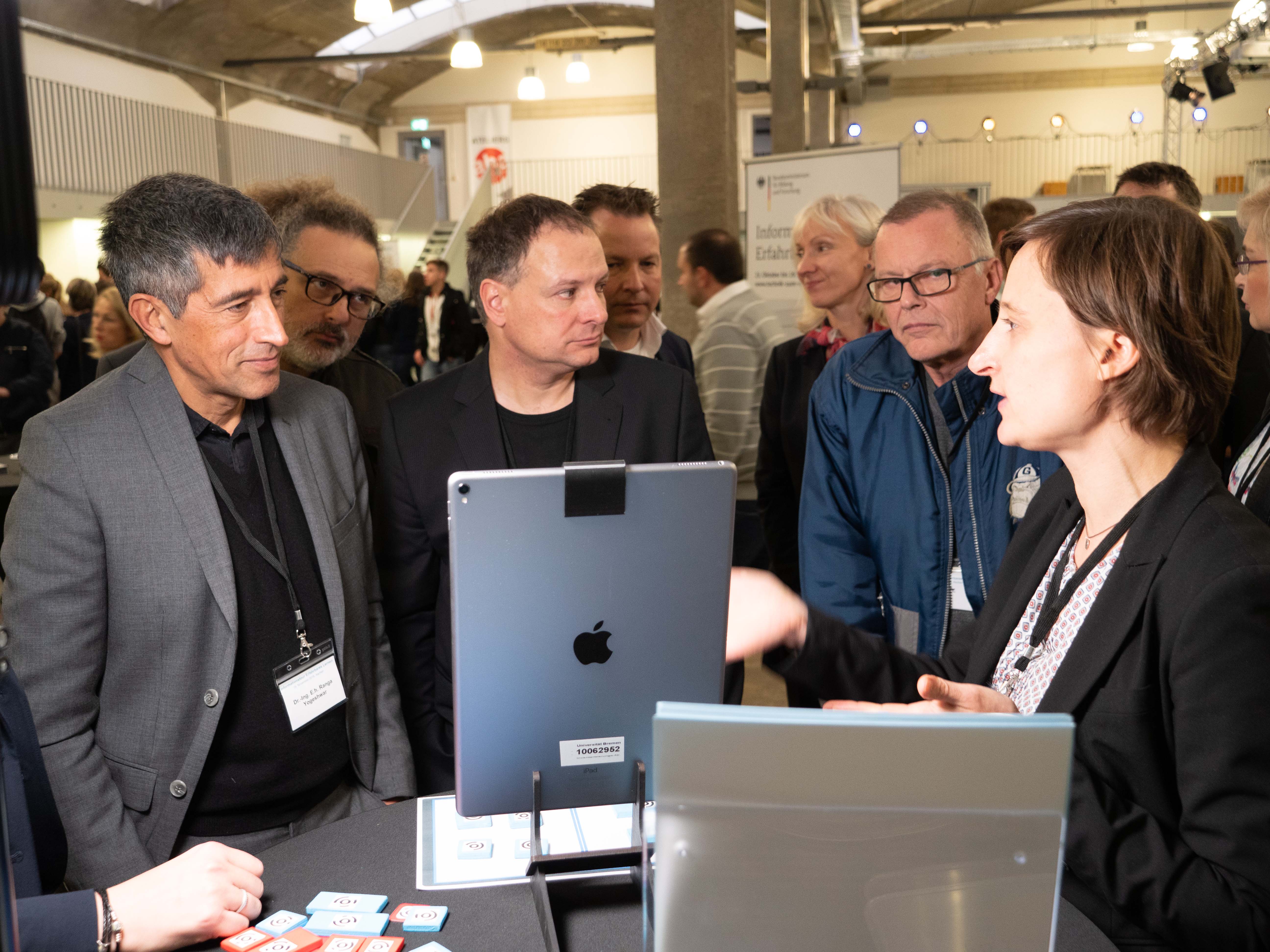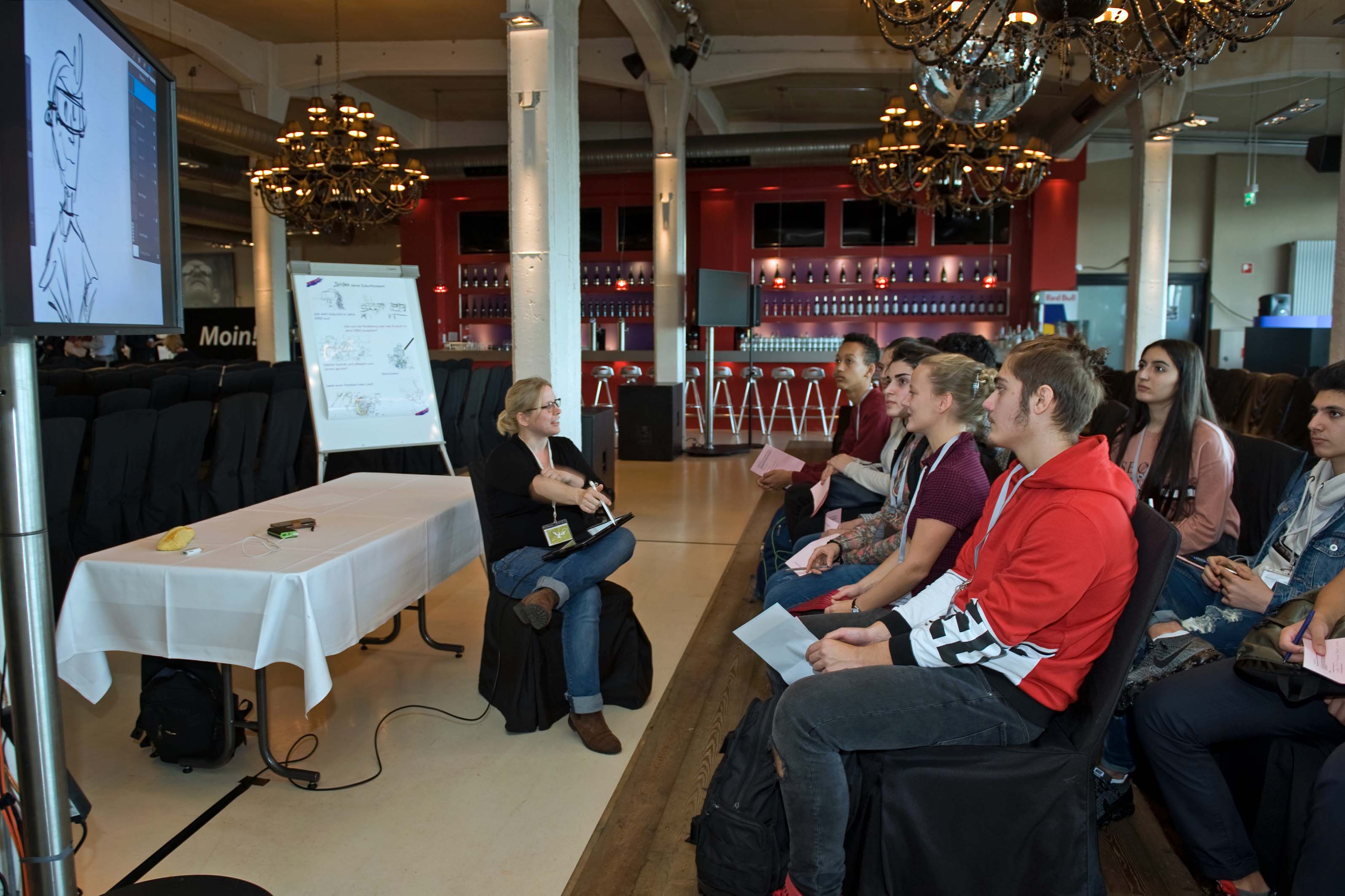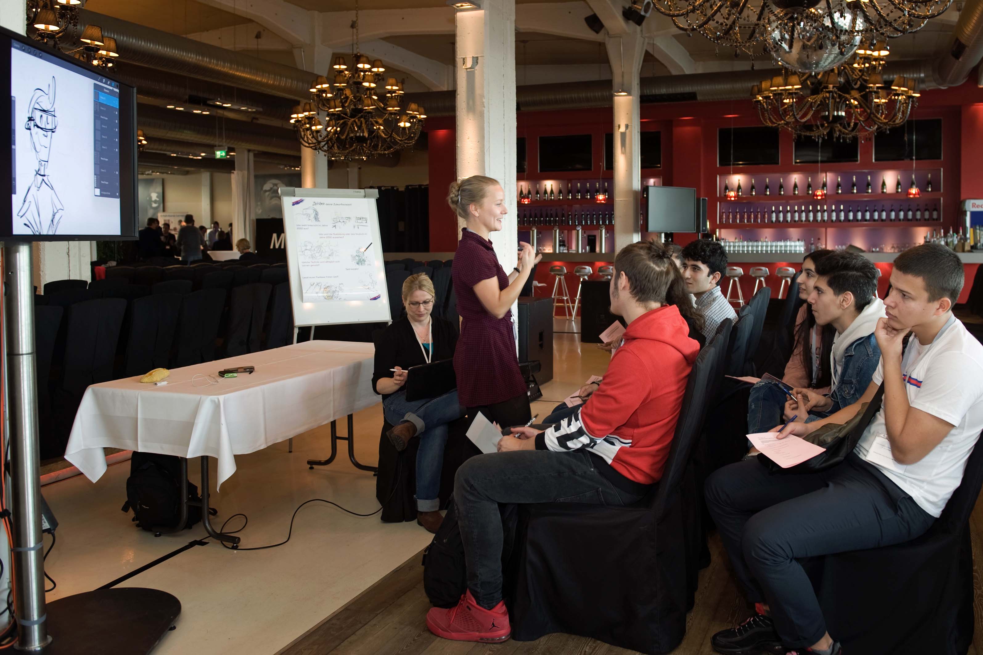 Am 6. November hießen wir Frau Eickmeyer-Hehn vom BMBF, das Team der VDI/VDE und die Projekte der Förderlinie in Bremen im Hudson Eventloft willkommen. In einem gemeinsamen, zweiteiligen Event mit i2b konnten nun in Bremen interessierte Schulklassen, Fachpublikum und Bürger*innen die beeindruckenden Ergebnisse der Forschungsprojekte anfassen und ausprobieren. Außerdem konnten die Schulklassen in Kollaboration mit einer professionellen Zeichnerin ihre Zukunftsvisionen von Schule zeichnen lassen. Parallel dazu gab es eine Podiumsdiskussion zum Thema „Digitalisierung und Schule“. Am Abend wurde dann in Zusammenarbeit im dem Netzwerk i2b der Hauptmerk auf die Wirtschaft gelegt und zahlreiche Interessierte aus der lokalen Wirtschaft folgten einer spannenden Einführungsvortrag von Prof. Dr. Malaka und einer Podiumsdiskussion zum Thema „Technologie für Aus- und Weiterbildung“.